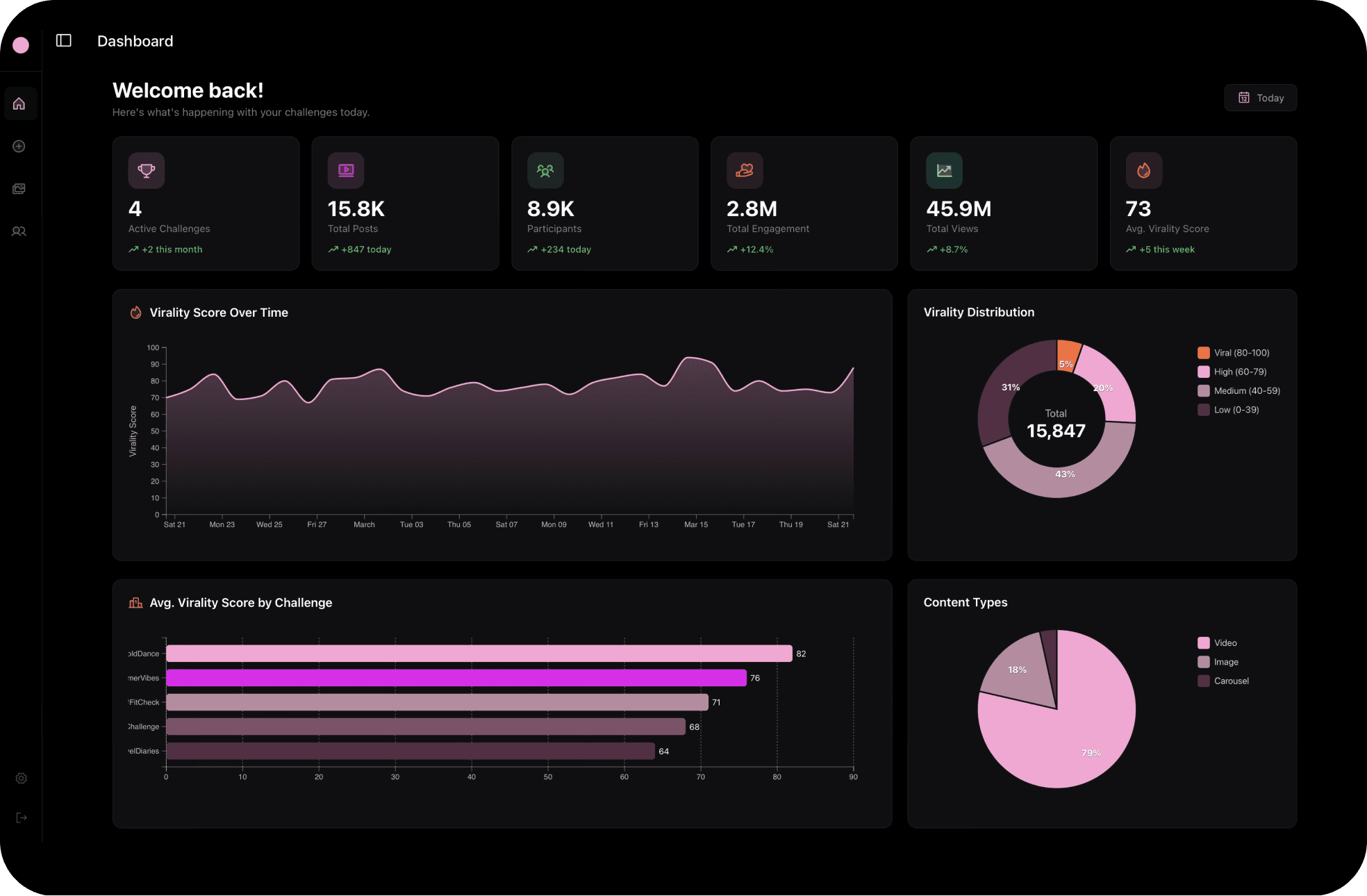 A challenge is an interactive social media format designed to engage communities and boost participation around a specific topic. Challenges encourage active involvement, leading to higher engagement rates, increased brand loyalty, and viral reach.